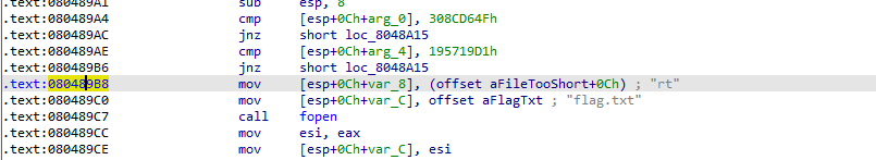 从0x80489B8的位置开始才能打开flag.txt,于是想办法跳转到这儿