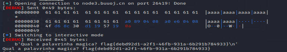 看了网上的wp有大佬说需要维护栈,由于远端服务器中gets函数没有正常退出,它程序会崩溃,就无法获取到flag ,此时使用exit函数使gets函数强制退出,那么就能获得flag了,于是我又修改了exp,找到exit函数的位置,这时候也不需要再考虑a1、a2位置在返回地址后了,可以完全根据get_flag函数的要求来,传两个满足条件的数上去,然后顺理成章打开flag.txt得到flag