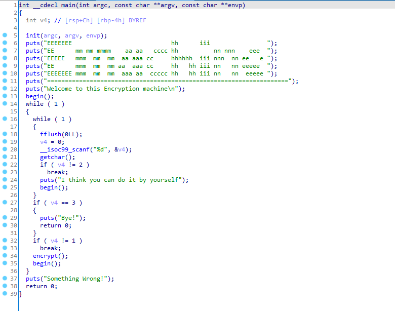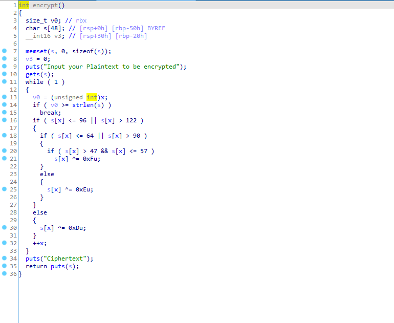 发现没有之前做的gets()栈溢出,但是发现了一个encrypt函数,点开之后查看,找到了gets函数