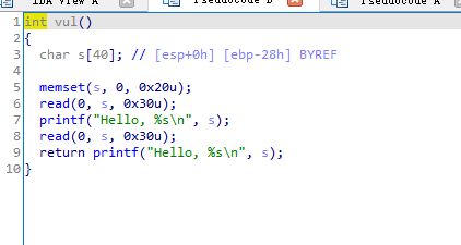 printf函数在输出时遇到’\0’会停止,若将s填满,这样在末尾就无法加上’\0’,就可以泄露ebp了
