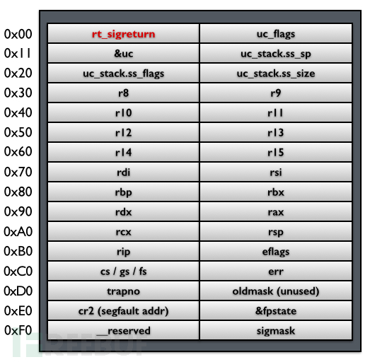 在恢复Signal信号的时候没有检测,也就是说我们可以通过改变Signal Frame中的信息来劫持控制流