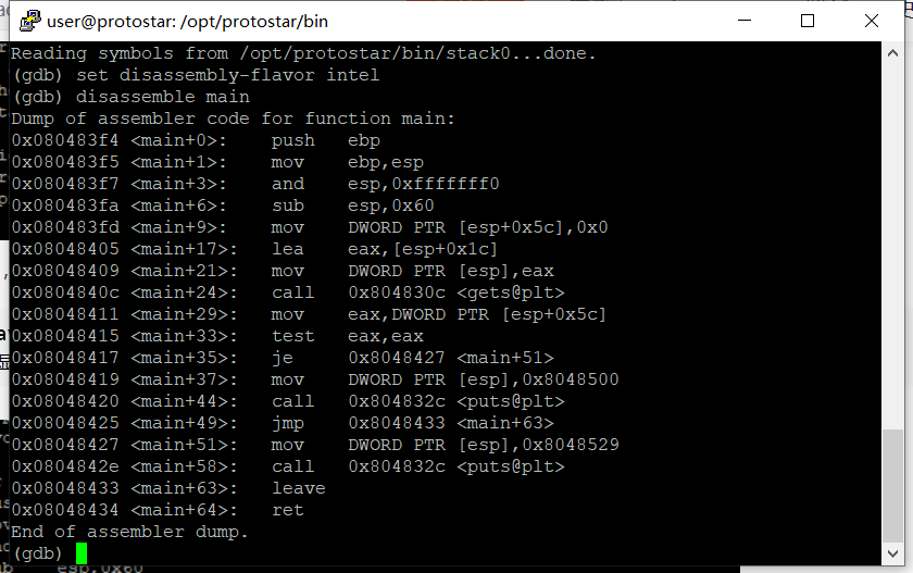 0x0804840c <main+24>: call 0x804830c <gets@plt>