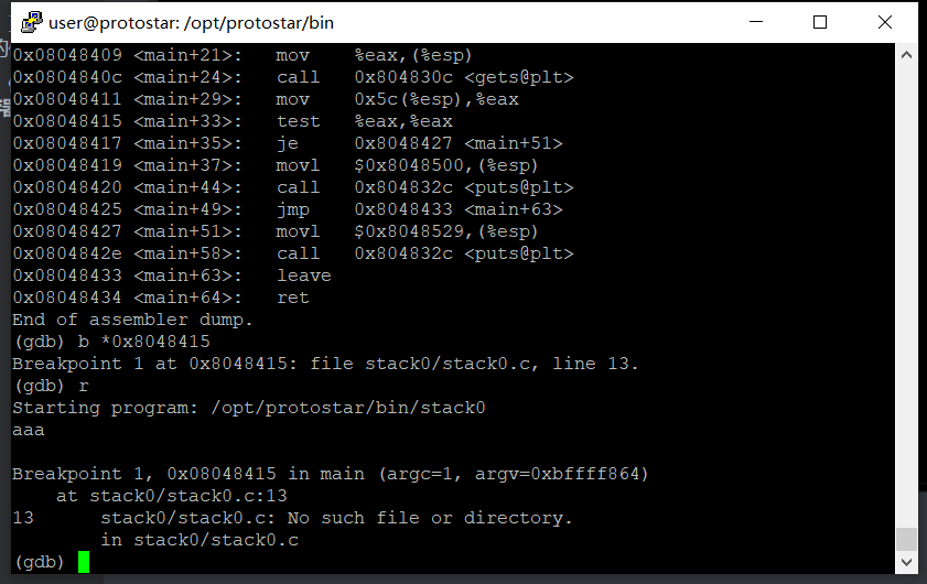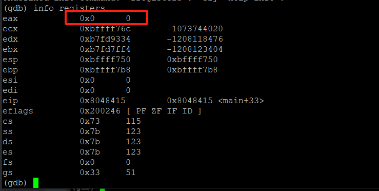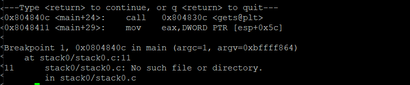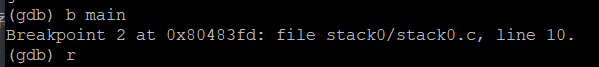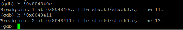 b *0x0804840c #断点意思就是让程序执行到此“停住”,不再往下执行