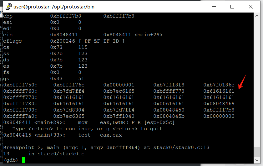 算了一下,我们需要68个字符才能覆盖(从第一个0x61开始一共有16个4字节才能到0x00000000,要覆盖他还有4字节,所以一共68个字节)