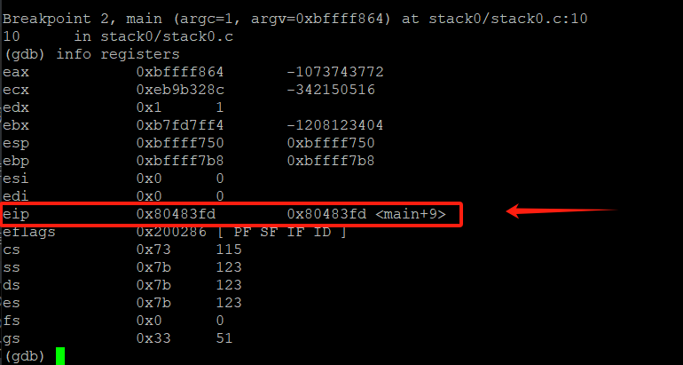 我打的断点地址为0x80483fd而eip寄存器的值也是0x80483fd