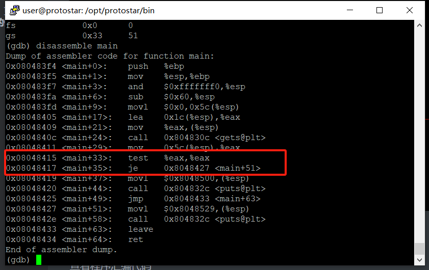 0x08048417 <main+35>: je 0x8048427 <main+51>