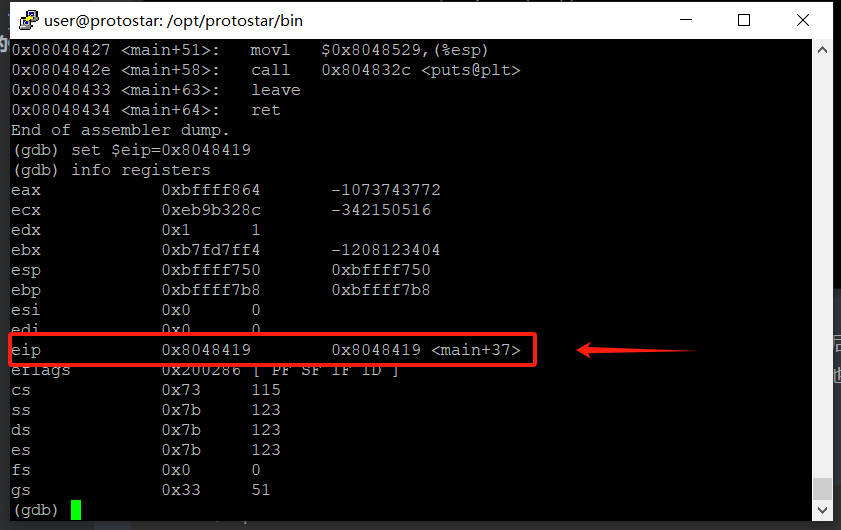 0x08048425 <main+49>: jmp 0x8048433 <main+63>