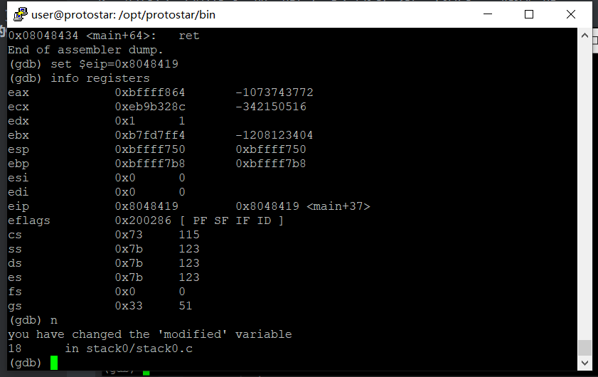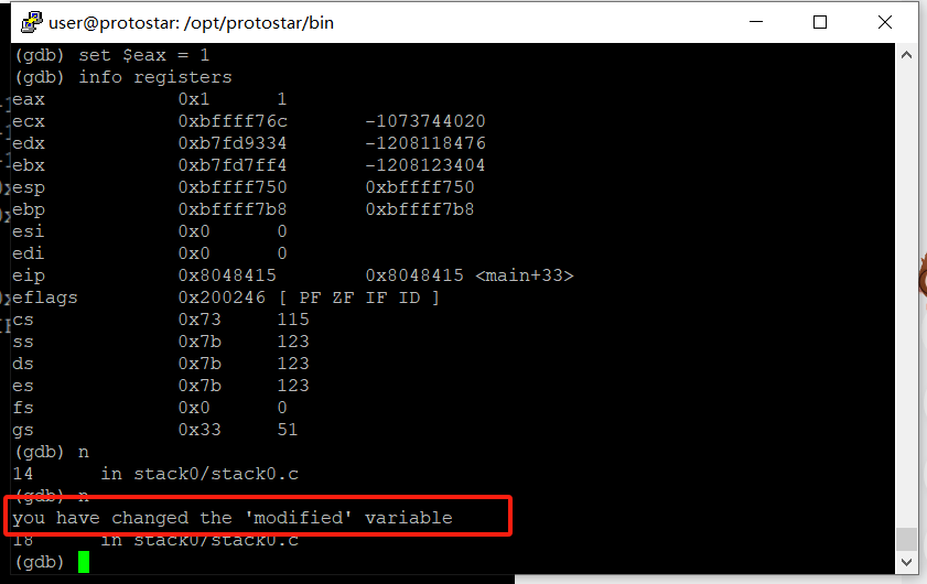 如果我们输入的值和程序设置的值不一样,就会跳转到0x8048427这个位置,然后输出try again,也就是破解失败,所以我们将eip寄存器的值修改成0x8048419,下一个地址调用了put函数,输出的是you have changed the ‘modified’ variable也就是破解成功了