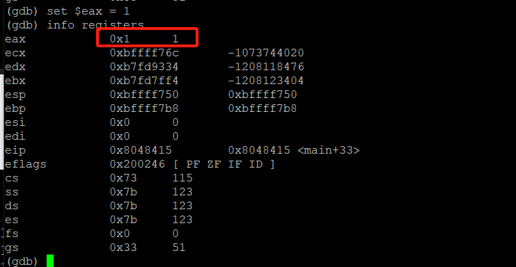 修改后再次查看所有寄存器里的值,可以看到,现在eip指向了我们指定的地址