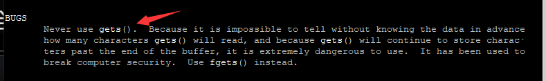 永远不要使用gets函数,因为如果事先不知道数据,就无法判断gets将读取多少个字符,因为gets将继续存储字符当超过缓冲区的末端时,使用它是极其危险的,它会破坏计算机安全,请改用fgets。