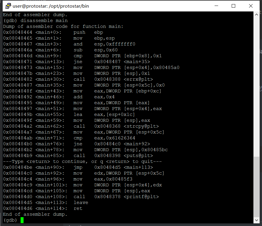 0x0804848f <main+43>: mov eax,DWORD PTR [ebp+0xc]