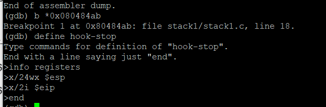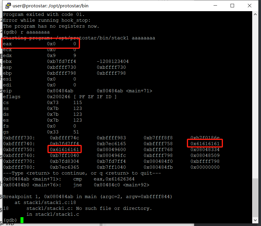 程序执行到我们设置的断点处自动执行了我们上面设置的命令,在这里可以看到我们输入的8个大写A在栈中的位置,并且eax寄存器里的值为0