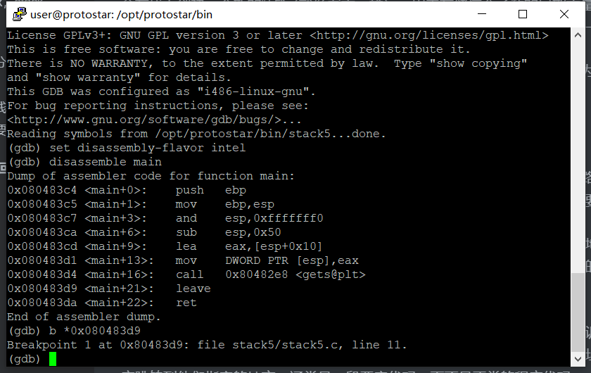使用gdb打开程序,在执行leave指令的地方下一个断点