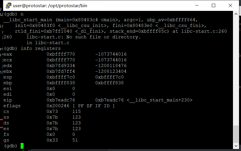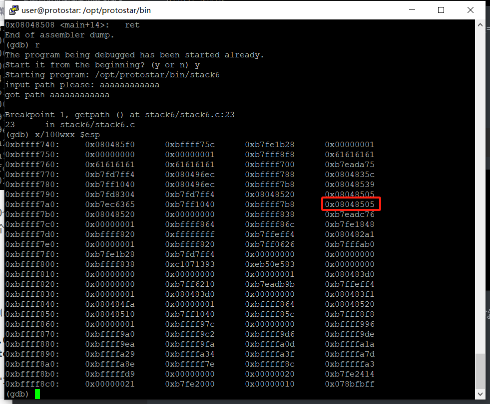 程序调用了getpath函数后,会返回0x08048505继续执行下一个指令,重新运行程序,随便输入一些字符,然后查看栈状态