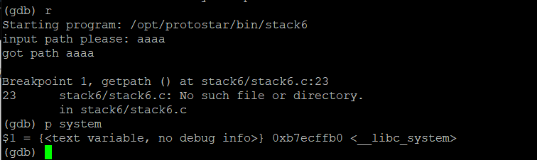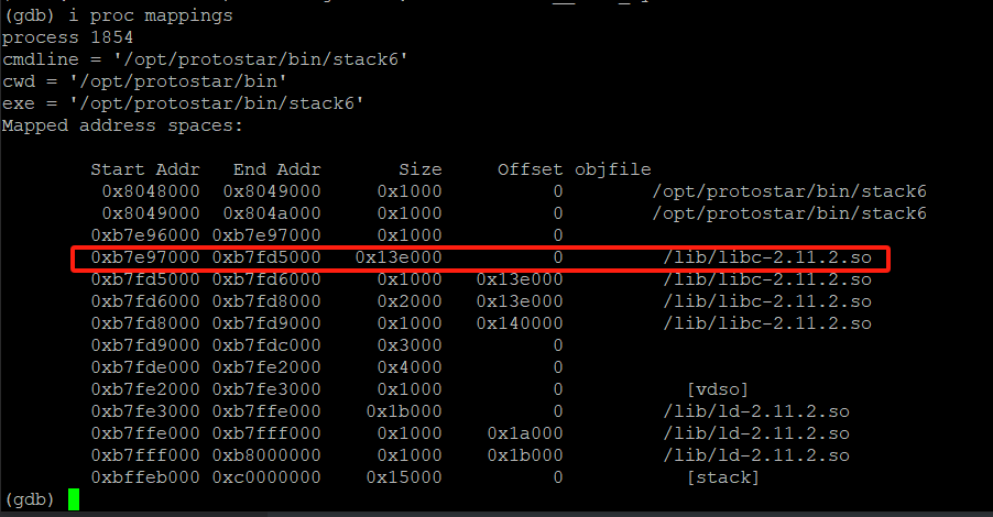 stack6的libc库为:**/lib/libc-2.11.2.so,libc的基地址为:0xb7e97000**
