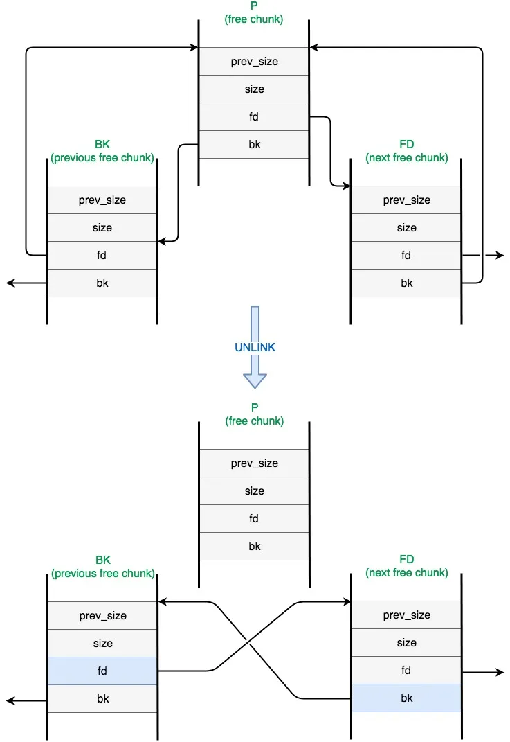 调用时,第一个参数 P 是要unlink的数据块,参数 BK 和 FD 是用于存储上一个和下一个空闲数据块指针的临时变量。当一个数据块被解除链接时,下一个空闲数据块 P->fd 和上一个空闲数据块 P->bk 会相互指向。