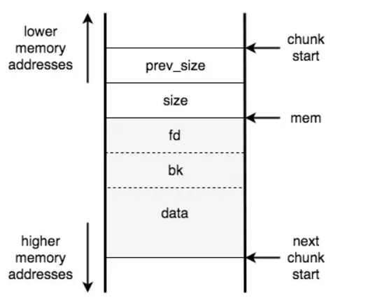 同样在空闲块中使用,指向双向空闲列表中的上一个空闲块。与 fd 一起,这些指针管理空闲内存,使得空闲内存的合并和重新分配更加高效。