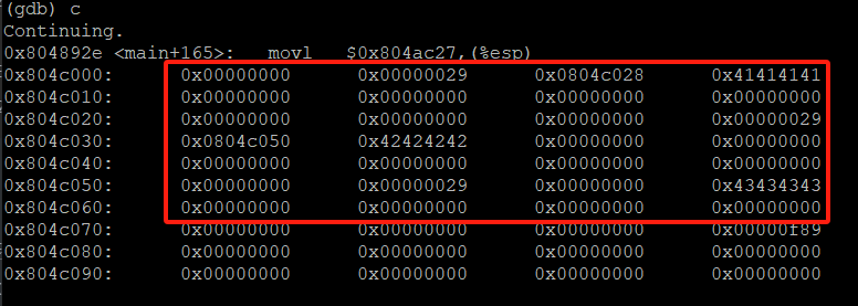 0x804c000: 0x00000000 0x00000029 0x41414141 0x00000000
