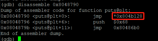 gdb将printf函数解析成了put函数,没什么问题,put函数的got表地址为0x804b128