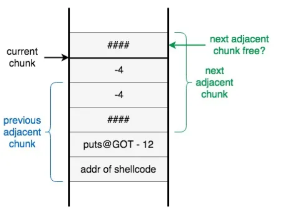 需要注意的是,shellcode 要很短(8 字节或更短),因为 “shellcode 的地址 “+8 处的内存将被 unlink 覆盖。