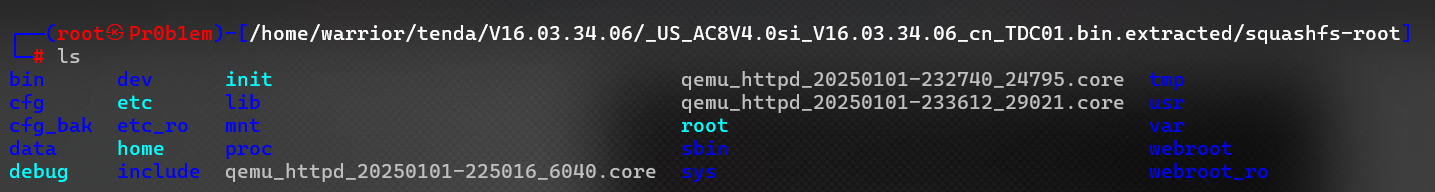 提取出来以后,有一个squashfs-root文件夹,类似于Linux系统的根目录,我这里多了几个qemu开头的文件,是因为我进行了虚拟环境测试漏洞存在而产生的,后续会讲到