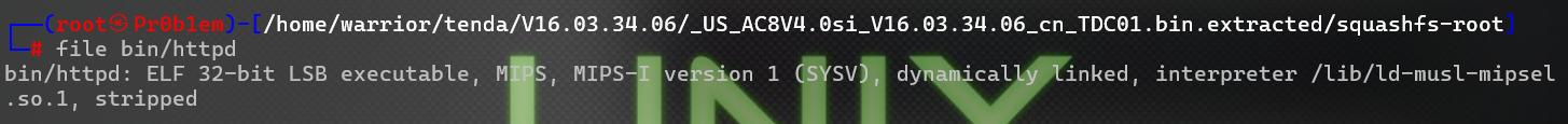 使用file指令查看了httpd文件的格式,是32位ELF文件,MIPS架构